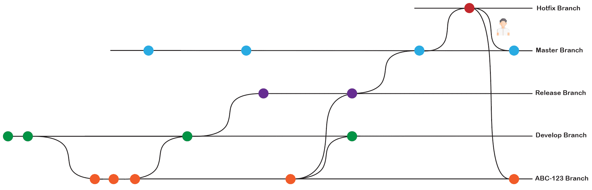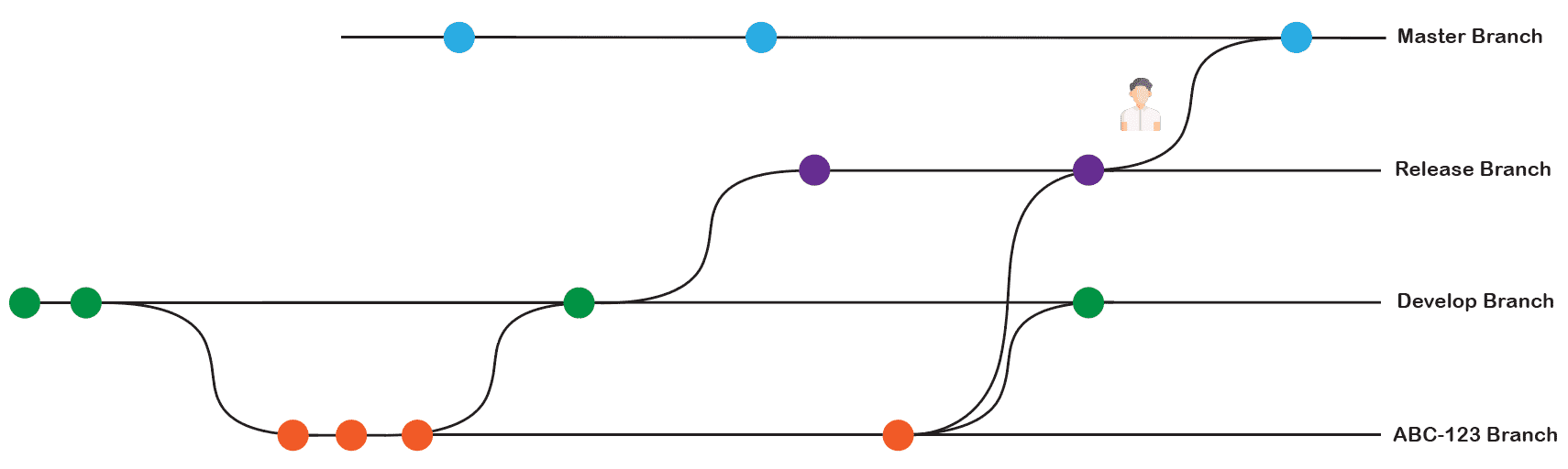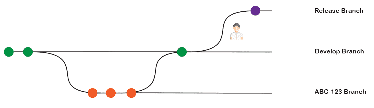 - Lokalde oluşturduğu ABC-123 branchi üzerinde tüm geliştirmesini tamamlayacak ve feature’un tamamlanmasının ardından develop branch’ine ABC-123 branch’ini merge edecek.